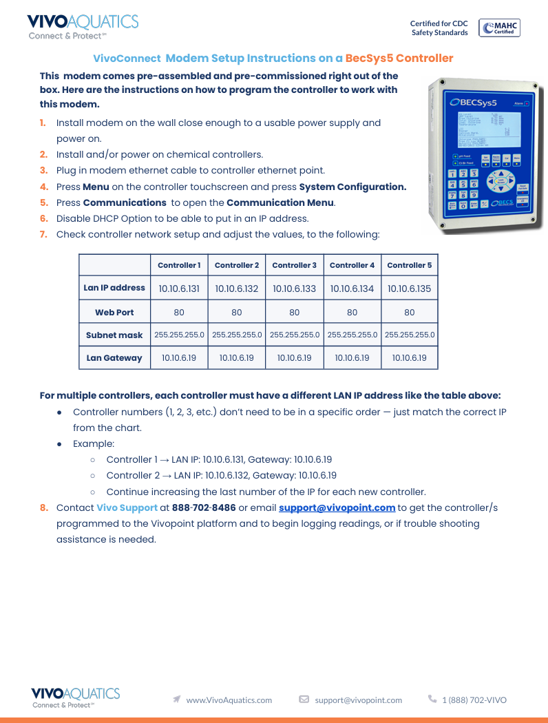 Install - BecSys5 Controller VivoConnect Setup This article will show how to connect a BecSys5 to the Vivopoint platform using a modem.